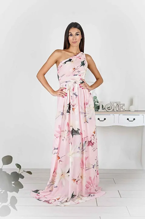 - Společenské šaty na jedno rameno, květované růžové